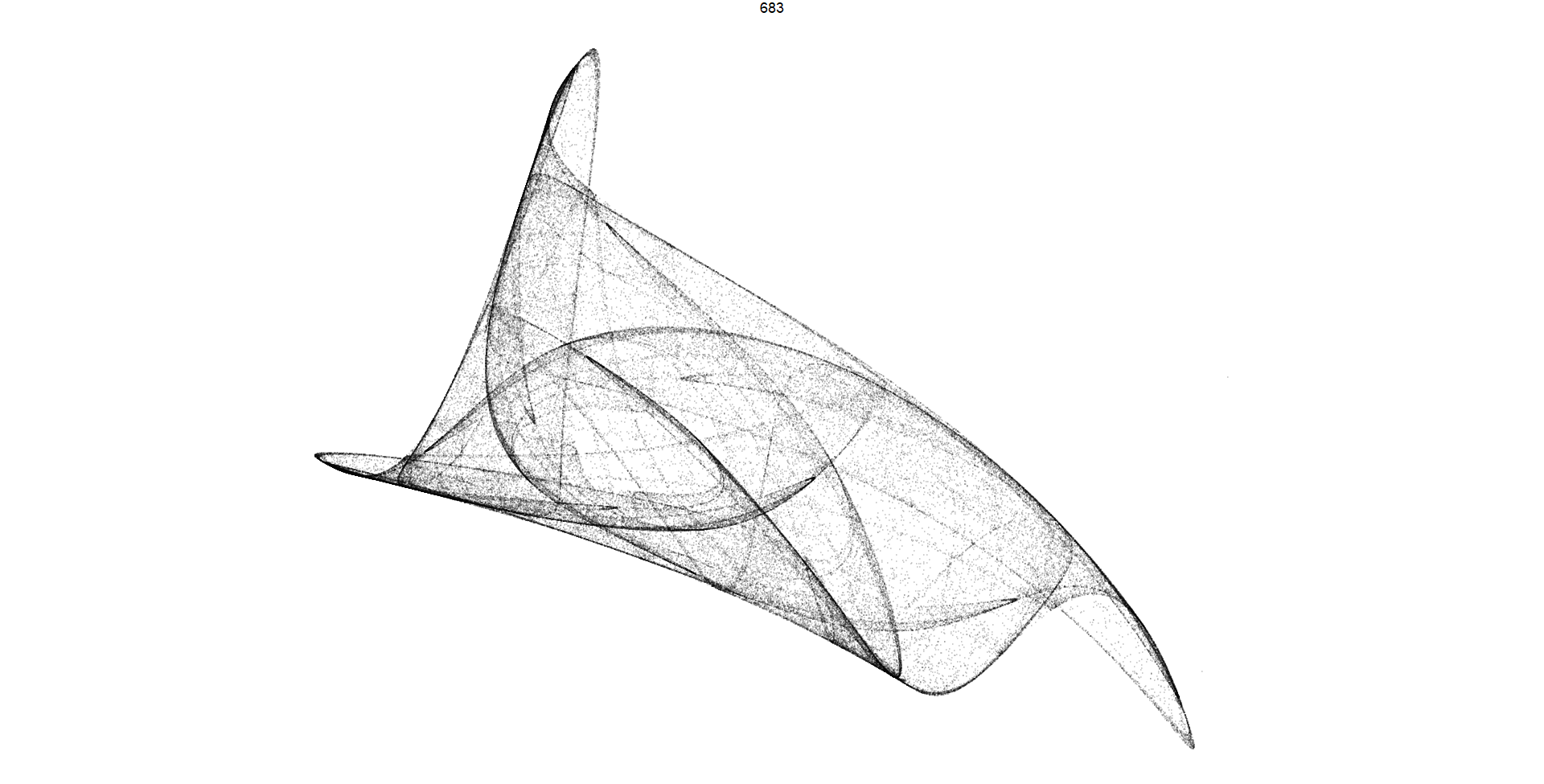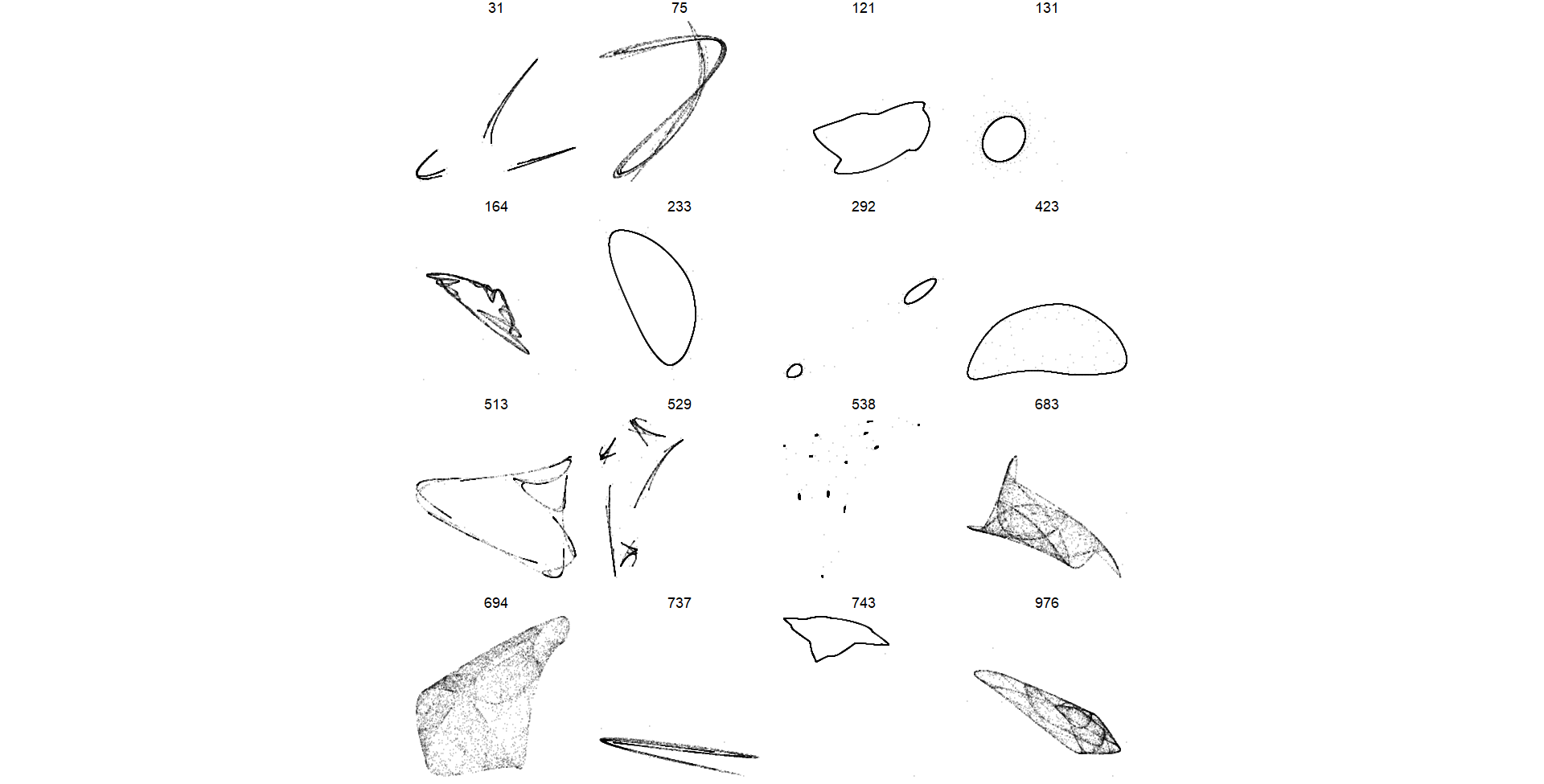 2. **Pattern 683:** This code selects a subset of data from the dataframe **`df`** where the **`pattern`** variable is equal to 683. It then proceeds to render a grid of plots representing trajectories associated with this specific pattern, using a large number of iterations (100,000) to capture intricate details of the trajectory behavior.