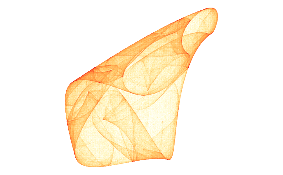 The resulting trajectory is then visualized using ggplot2, with each point represented as a pixel on the plot. The **`geom_point`** function is employed to plot the points, while **`coord_equal()`** ensures that the aspect ratio of the plot remains consistent. Additionally, the points are rendered with minimal size (**`size = 0`**) and transparency (**`alpha = 0.2`**), facilitating the visualization of the entire trajectory.