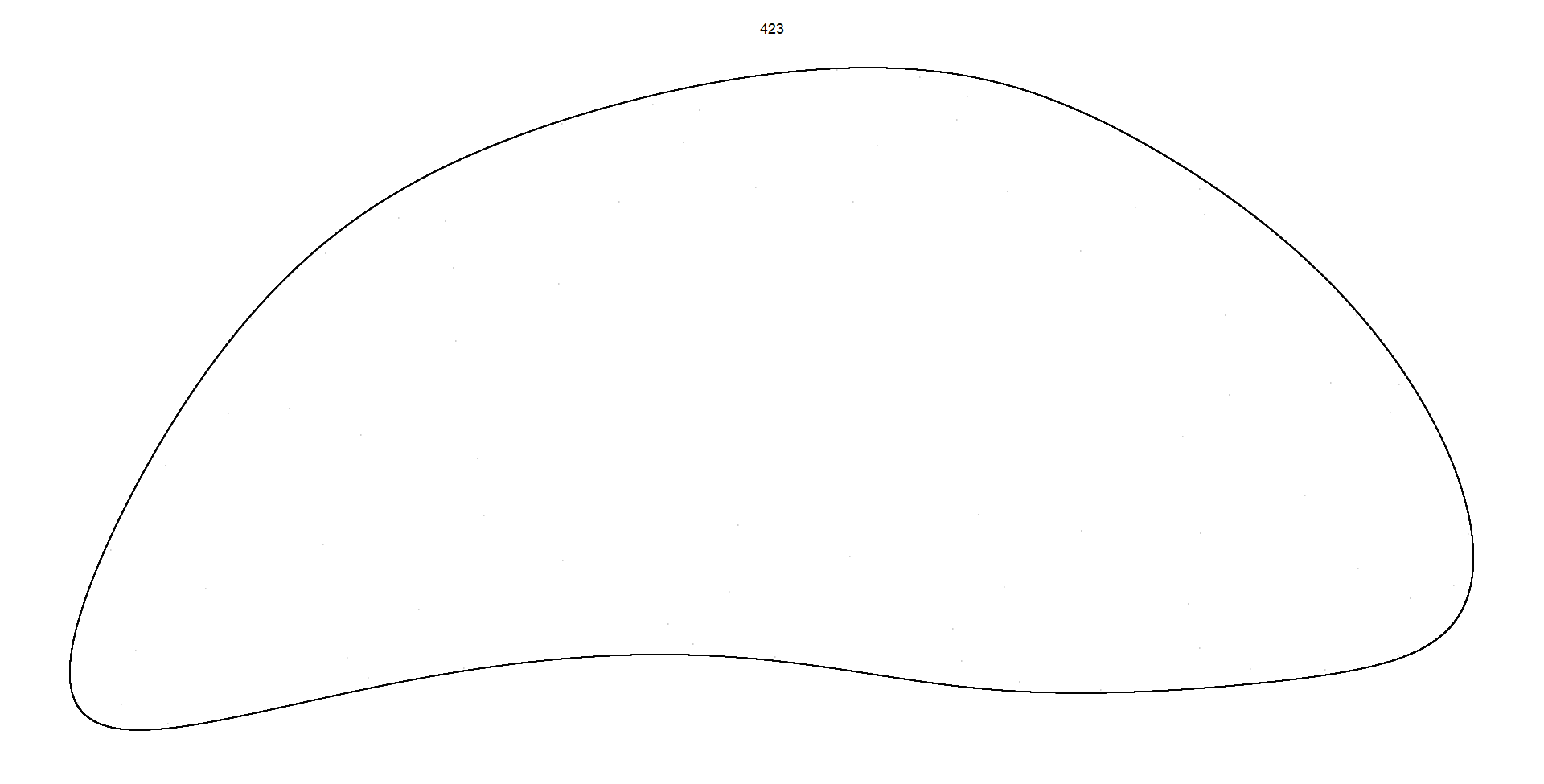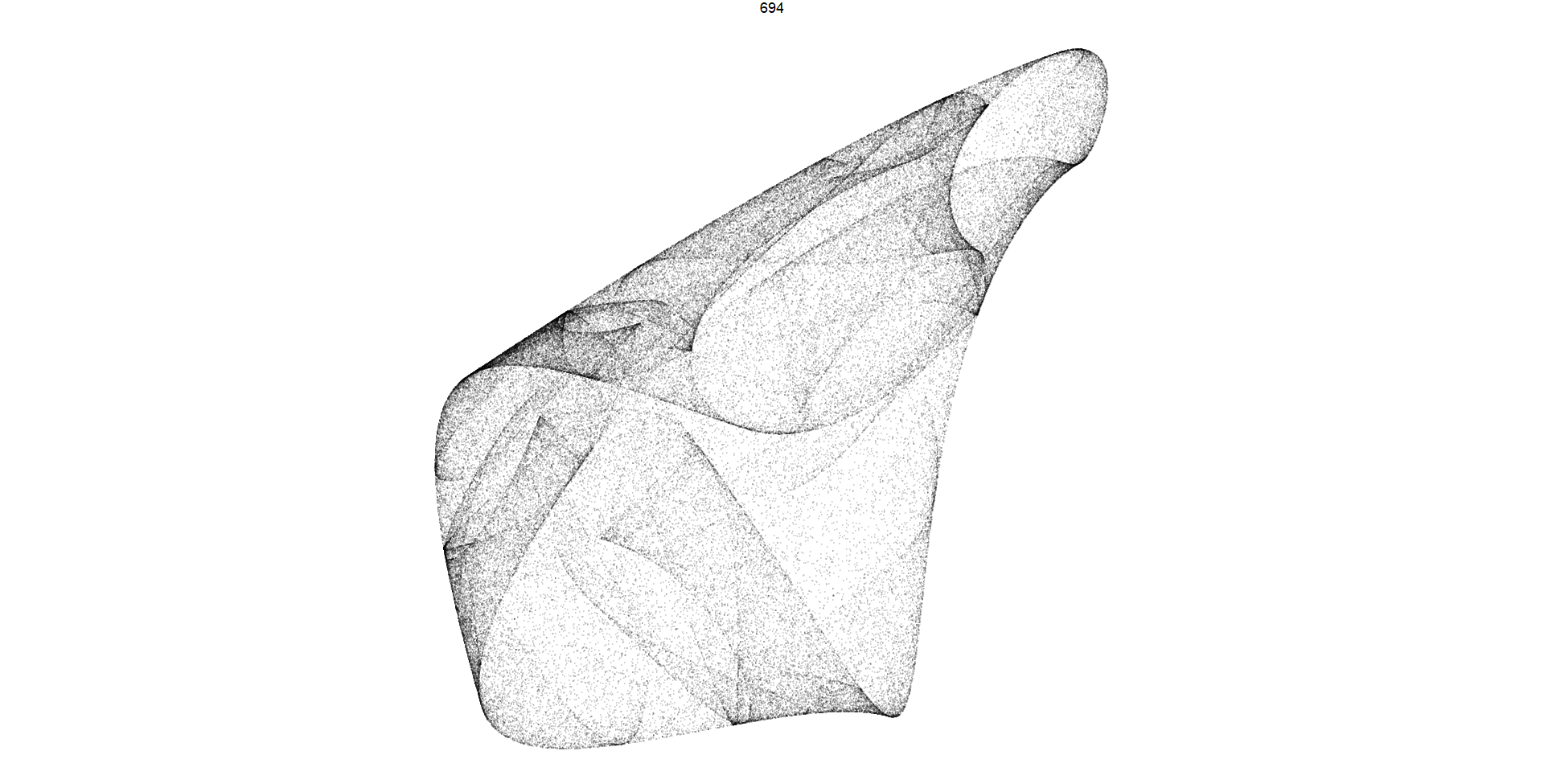 1. **Pattern 423:** This code filters the dataframe **`df`** to retain only the observations corresponding to **`pattern`** number 423. It then calls the **`render_grid`** function with this filtered subset of data and a specified number of iterations (100,000). The **`render_grid`** function generates and renders a plot representing the trajectory of parameter sets associated with pattern 423 in the 2D quadratic map, using a larger number of iterations to capture finer details of the trajectory.