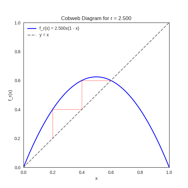 The cobweb animation thus serves as a dynamic portrait of the logistic map’s rich behavior. It captures the full spectrum of nonlinear phenomena — from convergence and periodicity to bifurcation and chaos — and illustrates how a simple quadratic function can encode profound mathematical complexity. This visual symphony of iterates invites us to explore the delicate interplay between structure and unpredictability in one of the most iconic systems in dynamical theory.
