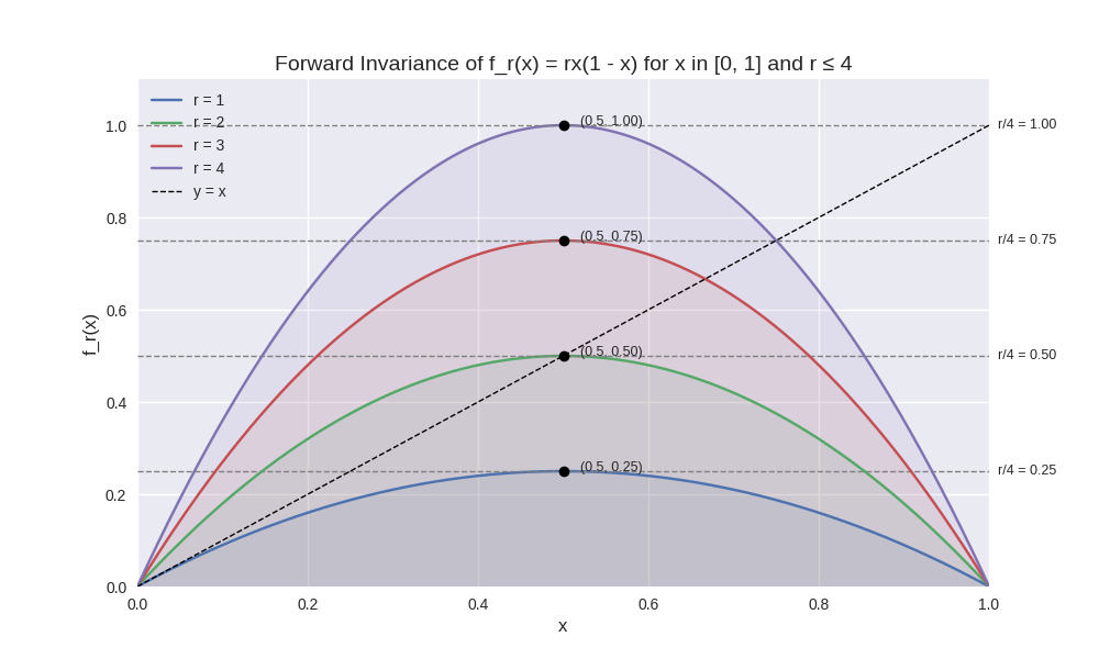 plays a central role in understanding interval dynamics, especially within the unit interval . First, consider the case when . The expression simplifies to , which is a symmetric quadratic with its maximum value at . At this point, the function attains its peak value of . This observation is crucial because it tells us that for any 𝑟 , the image of under is bounded above by 𝑟 ⋅ = . Therefore, the largest possible image of under is the interval .Now, when 𝑟 = 4 , we reach a special case: