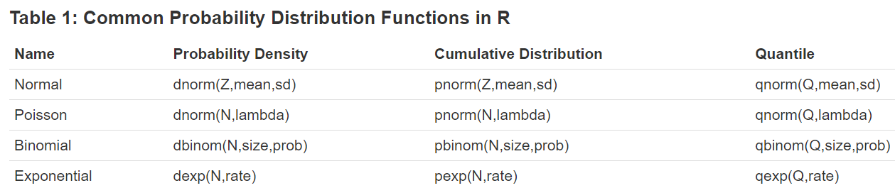 Each probability distribution in R is associated with four functions that follow a naming convention: the probability density function always begins with ‘d’, the cumulative distribution function always begins with ‘p’, the inverse cumulative distribution (or quantile function) always begins with ‘q’, and a function that produces random variables always begins with ‘r’. Each function takes a single argument at which to evaluate the function followed by specific parameters that define the particular distribution function to evaluate.