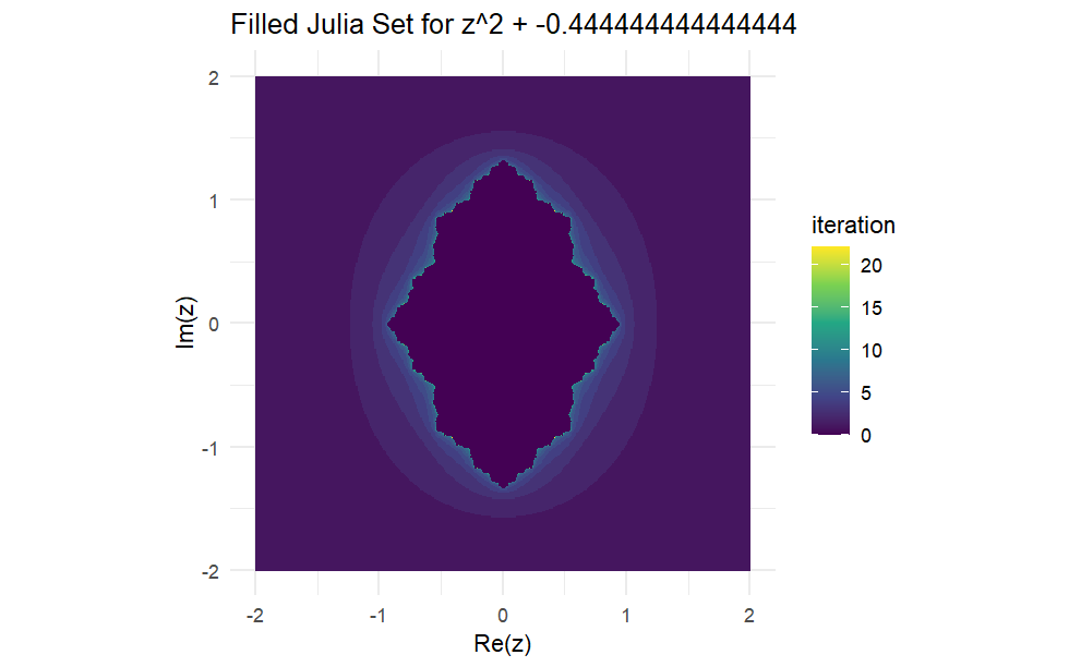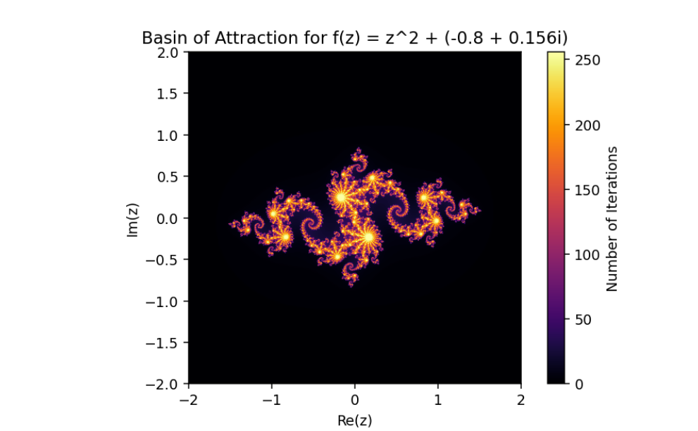 The set’s boundary, particularly for real values, lies between \(-2\) and \(\frac{1}{4}\), where points like \(c = -2\) remain bounded, but just beyond \(c = -2.1\), the sequence diverges. This iterative process is key to understanding the fractal structure and complexity of the Mandelbrot set.