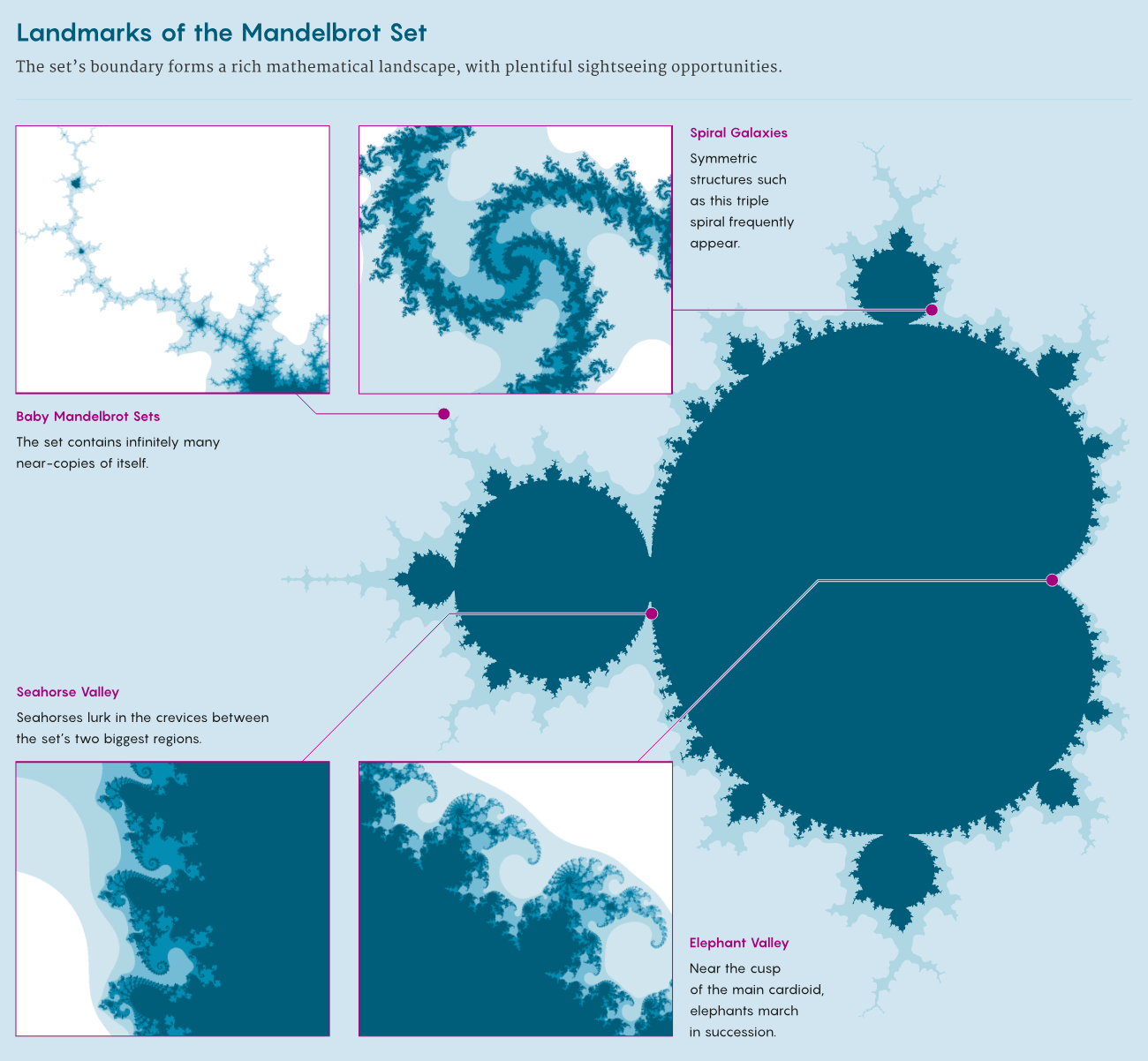 The Mandelbrot set has many intriguing features, but the biggest mysteries lie in its complex fractal boundary. Zooming into different boundary regions reveals some astounding features. A valley of seahorses, parades of elephants and a miniature version of the set itself.